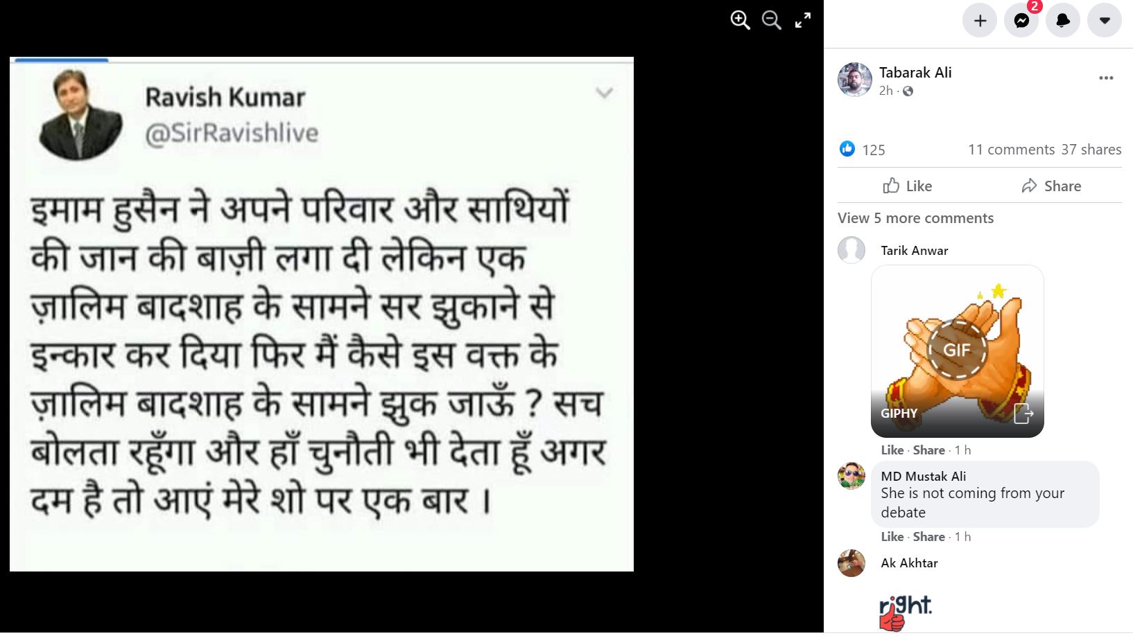 वायरल हो रहे ट्वीट के स्क्रीनशॉट में कर्बला की लड़ाई (Battle of Karbala) का ज़िक्र करते हुए लिखा गया है: "इमाम हुसैन ने अपने परिवार और साथियों की जान की बाज़ी लगा दी लेकिन एक ज़ालिम बादशाह के सामने सर झुकाने से इन्कार कर दिया फिर मैं कैसे इस वक्त के ज़ालिम बादशाह के सामने झुक जाऊँ ? सच बोलता रहूँगा और हाँ चुनौती भी देता हूँ अगर दम है तो आएं मेरे शो पर एक बार"