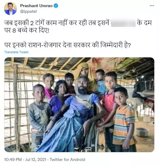 वायरल तस्वीर में व्हीलचेयर पर बैठे एक व्यक्ति और उसके परिवार के सदस्यों का चित्र दिखाया गया है. इसे अधिवक्ता प्रशांत पटेल उमराव ने शेयर किया है, जिन्हें पहले भी सांप्रदायिक व फ़र्ज़ी ख़बर फैलाते हुए पाया गया है.