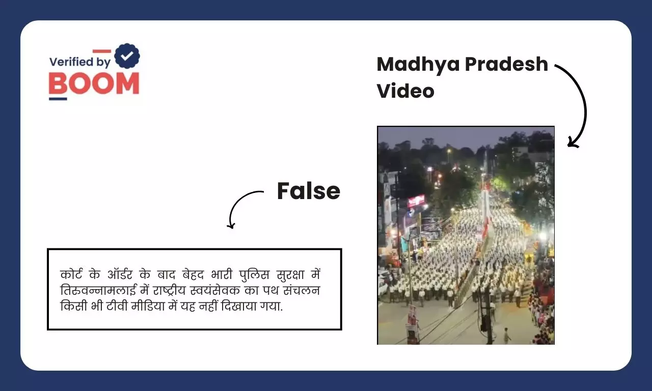 राष्ट्रीय स्वयंसेवक संघ के सदस्यों के पथ संचलन का एक वीडियो सोशल मीडिया पर इस दावे से वायरल है कि तमिलनाडु के तिरुवन्नामलाई में कोर्ट के ऑर्डर के बाद पुलिस सुरक्षा में राष्ट्रीय स्वयंसेवक का पथ संचलन हुआ.
