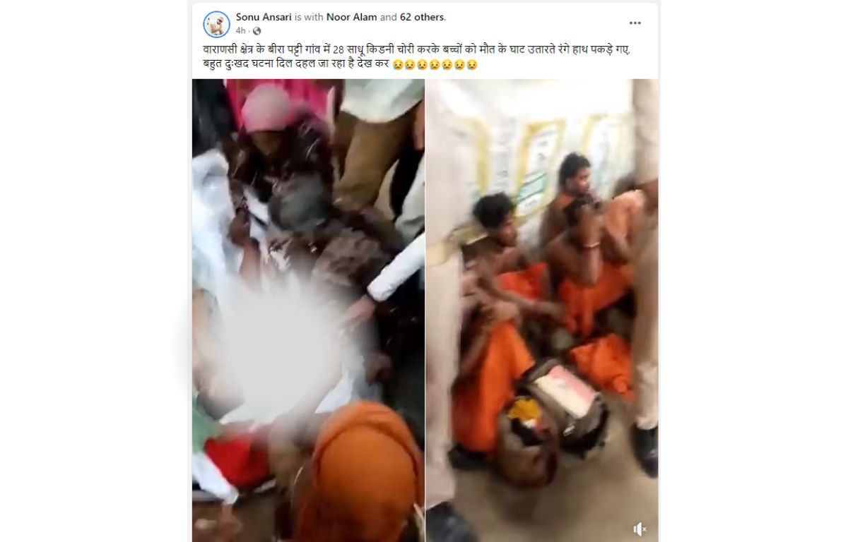 फ़ेसबुक अकाउंट द्वारा शेयर किए दोनों वीडियो को इस कैप्शन के साथ शेयर किया जा रहा है, जिसमें लिखा हुआ है "वाराणसी क्षेत्र के बीरा पट्टी गांव में 28 साधू किडनी चोरी करके बच्चों को मौत के घाट उतारते रंगे हाथ पकड़े गए, बहुत दुःखद घटना दिल दहल जा रहा है देख कर".