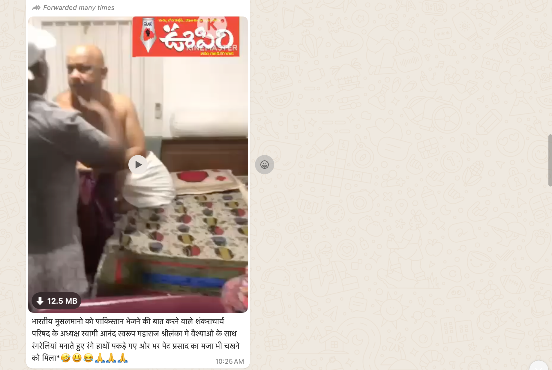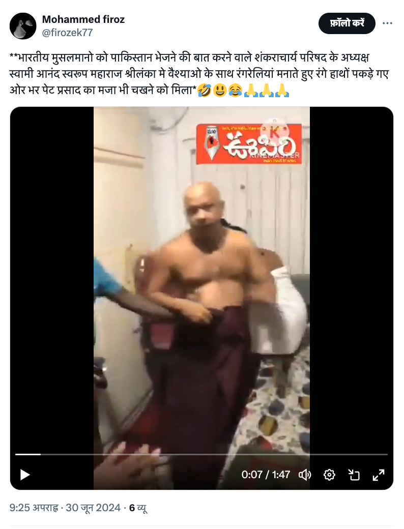 एक यूजर ने एक्स पर वीडियो को शेयर करते हुए लिखा, 'भारतीय मुसलमानों को पाकिस्तान भेजने की बात करने वाले शंकराचार्य परिषद के अध्यक्ष स्वामी आनंद स्वरूप महाराज श्रीलंका में वैश्याओं के साथ रंगरेलियां मनाते हुए रंगे हाथों पकड़े गए और भर पेट प्रसाद का मजा भी चखने को मिला.'