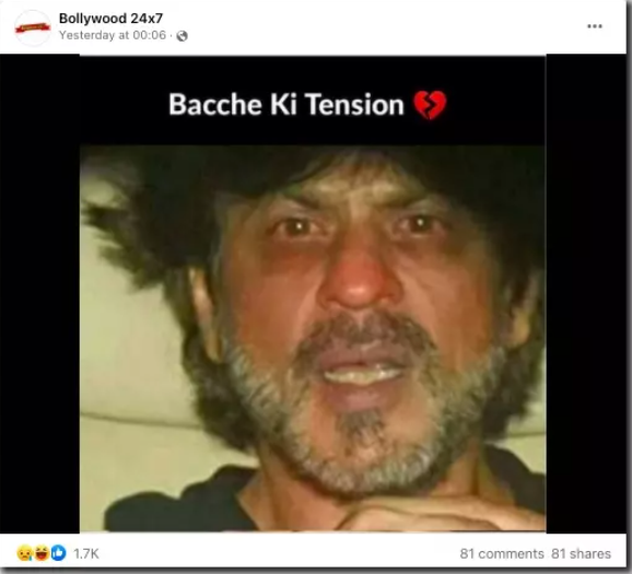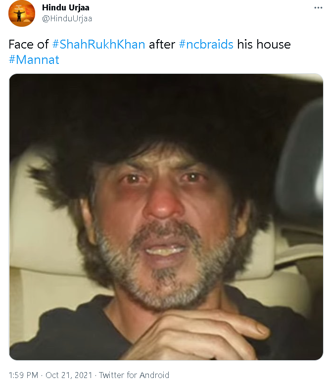 शाहरुख़ खान की इस तस्वीर को शेयर कर कैप्शन दिया गया 'शाहरुख खान के घर मन्नत नें एनसीबी की रेड पड़ी तो इसका चेहरा देखो