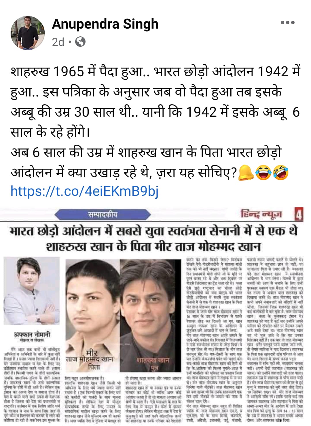 कई दक्षिणपंथी फेसबुक यूज़र्स ने 'भारत छोड़ो आंदोलन में सबसे युवा स्वतंत्रता सेनानी में से एक थे शाहरुख़ खान के पिता मीर ताज मोहम्मद खान' शीर्षक से एक लेख पर संदेह जताया है. अफ्फान नोमानी द्वारा लिखा गया लेख 6 अक्टूबर, 2021 को हिंद न्यूज वेबसाइट पर प्रकाशित हुआ था. साथ ही शाहरुख़ खान और उनके पिता की सही आयु के साथ छेड़छाड़ करके दावा किया जा रहा है कि भारत छोड़ो आंदोलन के समय मीर ताज मोहम्मद की आयु महज़ 6 साल रही होगी.