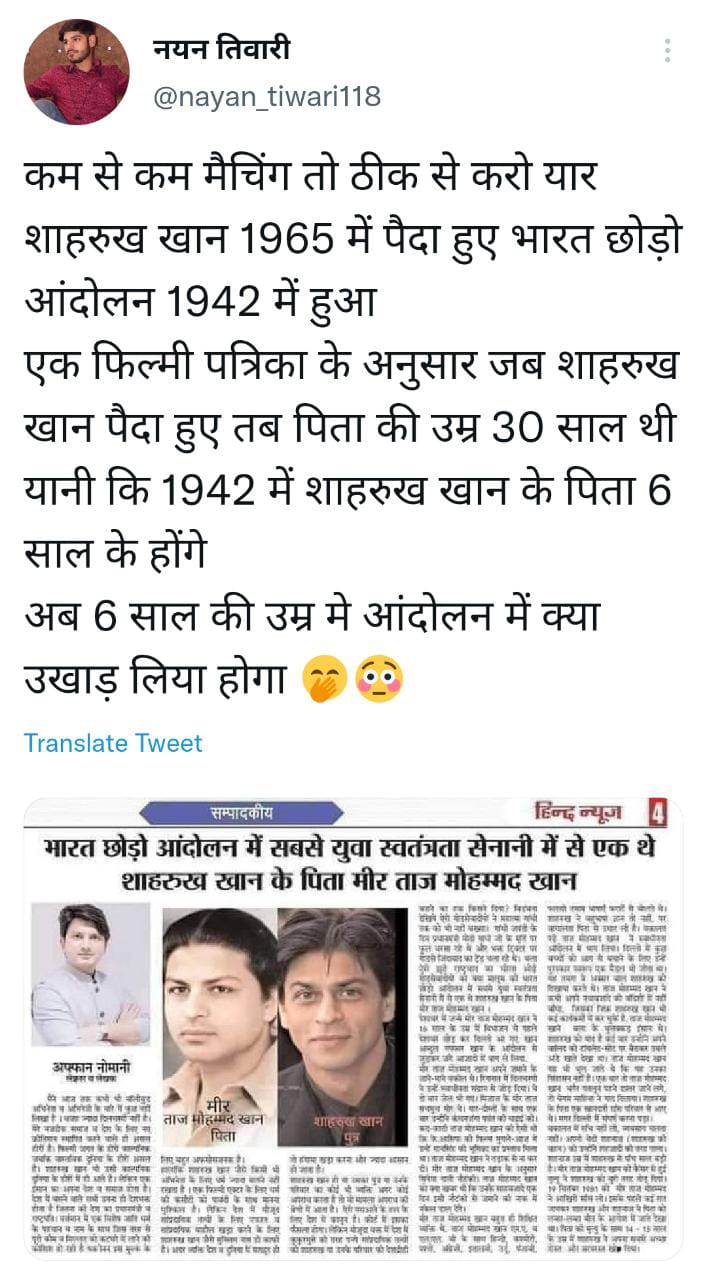 वायरल पोस्ट में लेख का स्क्रीनशॉट शेयर करके इसकी सत्यता पर सवाल उठाते हुए दावा किया जा रहा है कि "शाहरुख खान 1965 में पैदा हुए भारत छोड़ो आंदोलन 1942 में हुआ. एक फिल्मी पत्रिका के अनुसार जब शाहरुख खान पैदा हुए तब पिता की उम्र 30 साल थी यानी कि 1942 में शाहरुख खान के पिता 6 साल के होंगे. अब 6 साल की उम्र मे आंदोलन में क्या उखाड़ लिया होगा."