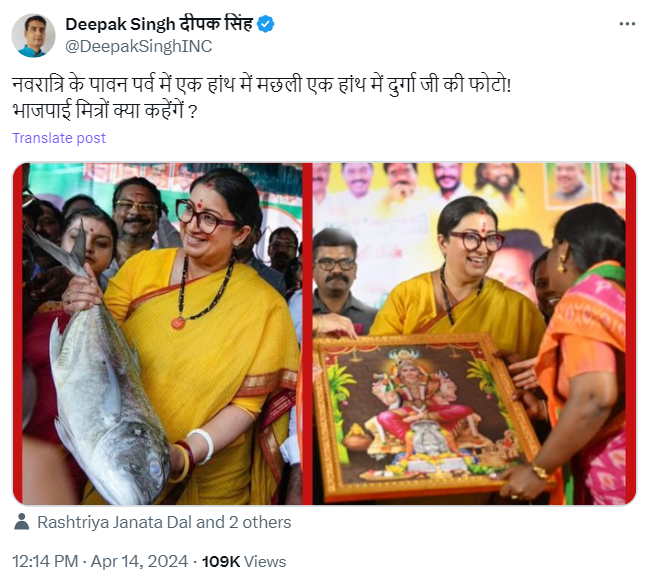 एक्स पर इस कोलाज को शेयर करते हुए एक कांग्रेसी हैंडल ने लिखा, 'नवरात्रि के पावन पर्व में एक हाथ में मछली, एक हाथ में दुर्गा जी की फोटो! भाजपाई मित्रों क्या कहेंगें ?'