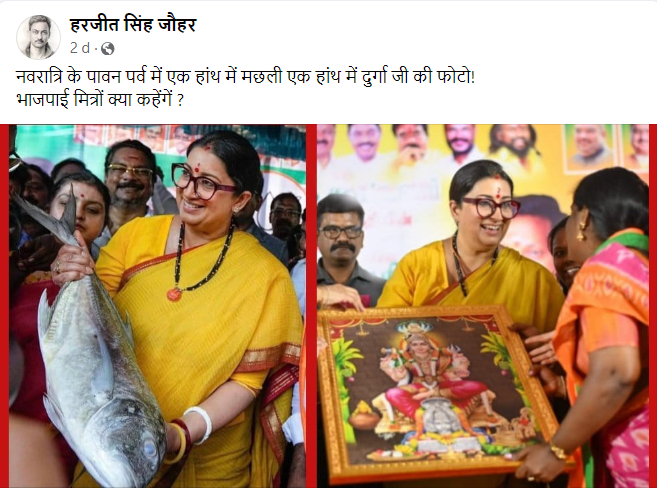 सोशल मीडिया पर केंद्रीय मंत्री स्मृति ईरानी की दो तस्वीरों का एक कोलाज वायरल है. कोलाज की पहली तस्वीर में उनको हाथ में मछली लिए देखा जा सकता है. वहीं दूसरी तस्वीर में सेम कपड़ों में वह देवी दुर्गा की एक तस्वीर लिए नजर आ रही हैं. इन तस्वीरों को नवरात्रि का बताकर शेयर किया जा रहा है.