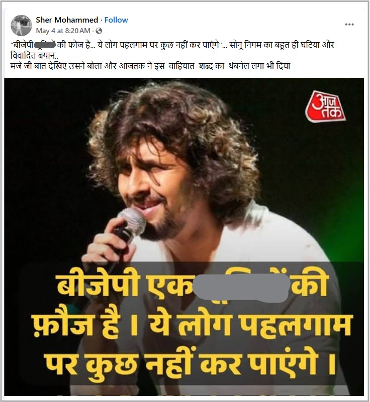 सिंगर सोनू निगम के बेंगलुरु कॉन्सर्ट के बाद हुए विवाद के बीच सोशल मीडिया पर न्यूज चैनल आज तक के लोगो के साथ एक ग्राफिक जमकर वायरल हो रहा है. इस ग्राफिक में सोनू निगम के हवाले से बीजेपी के लिए अभद्र भाषा का इस्तेमाल करते हुए लिखा है कि ये लोग पहलगाम पर कुछ नहीं कर पाएंगे.