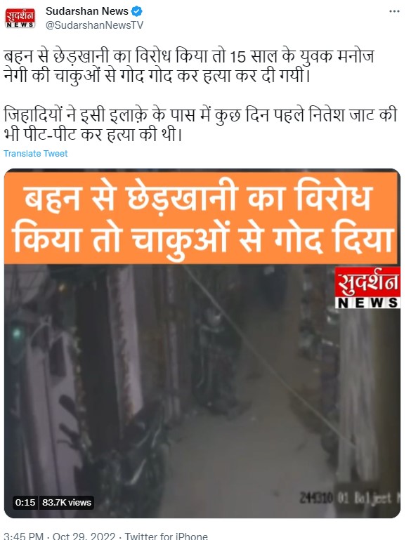 सुदर्शन न्यूज़ ने सीसीटीवी फुटेज को ट्विटर पर शेयर करते हुए कैप्शन दिया है, "बहन से छेड़खानी का विरोध किया तो 15 साल के युवक मनोज नेगी की चाकुओं से गोद गोद कर हत्या कर दी गयी। जिहादियों ने इसी इलाक़े के पास में कुछ दिन पहले नितेश जाट की भी पीट-पीट कर हत्या की थी।".