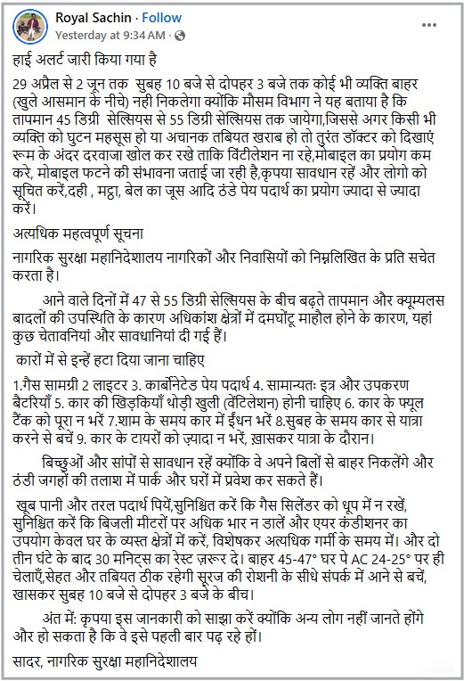 इस वायरल मैसेज में 29 अप्रैल से 2 जून के बीच सुबह 10 बजे से दोपहर 3 बजे के बीच लोगों को बाहर न जाने की सलाह दी गई है क्योंकि इस बीच तापमान 45 डिग्री सेल्सियस से 55 डिग्री सेल्सियस के बीच बढ़ जाएगा.