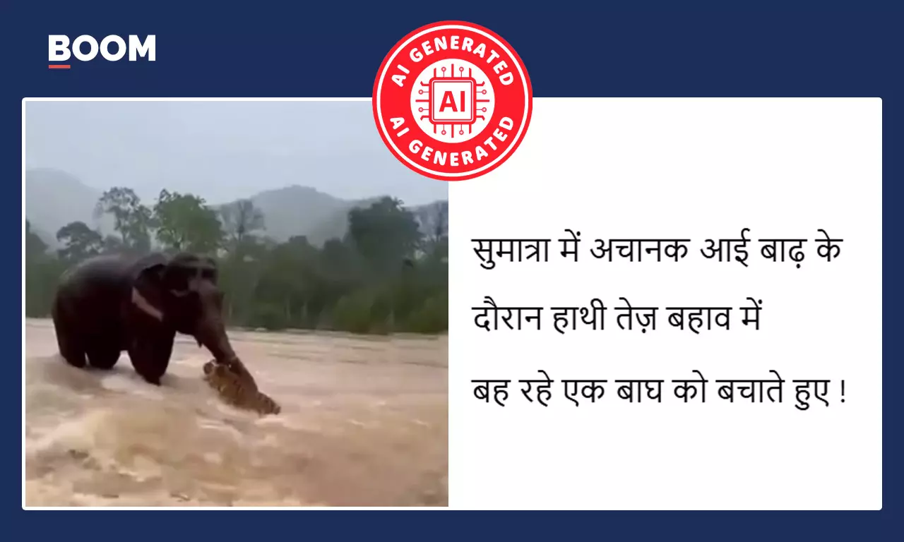 सोशल मीडिया पर इंडोनेशिया के सुमात्रा में एक हाथी द्वारा बाघ का रेस्क्यू किए जाने के दावे से एक वीडियो वायरल है. दावा किया जा रहा है कि सुमात्रा में भारी बाढ़ के बीच एक हाथी ने एक बाघ को बचा लिया. वीडियो में एक हाथी को देखा जा सकता है, जो तेज बहते पानी के बीच एक बाघ की सहायता करता है और उसे अपनी पीठ पर बैठाकर चल देता है.