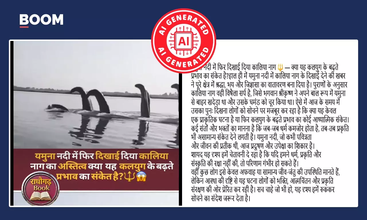 उत्तर प्रदेश के वृंदावन में यमुना नदी में कालिया नाग दिखाई देने के दावे से सोशल मीडिया पर एक वीडियो वायरल है. वीडियो में पानी में कोबरा सांप जैसे दिख रहे जीव और नाव पर सवार कुछ लोगों को देखा जा सकता है.