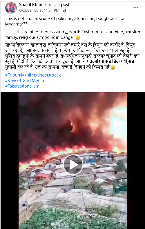 सोशल मीडिया पर एक वीडियो को शेयर कर दावा किया जा रहा है कि वो त्रिपुरा की मुस्लिम बस्ती में भयंकर आगजनी का वीडियो है. वीडियो में एक घनी बस्ती में भयंकर आग लगी हुई दिख रही है. लोग अपना सामान लेकर इधर उधर भागते दौडते नज़र आ रहे हैं. सोशल मीडिया पर इसे त्रिपुरा का बताया जा रहा है.