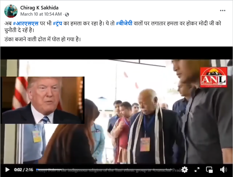 सोशल मीडिया पर अमेरिकी राष्ट्रपति डोनाल्ड ट्रंप का एक वीडियो वायरल हो रहा है. वीडियो में ट्रंप राष्ट्रीय स्वयंसेवक संघ (आरएसएस) पर अरुणाचल प्रदेश में दंगे भड़काने और तानी जनजातियों के बीच मतभेद को बढ़ावा देने का आरोप लगाते नजर आ रहे हैं.