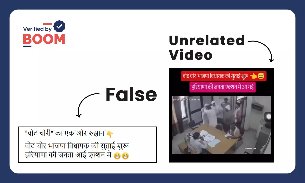सोशल मीडिया पर हरियाणा में वोट चोरी करने वाले भाजपा विधायक की पिटाई के दावे से एक वीडियो वायरल है. वायरल वीडियो में एक कमरे में 2 लोगों को बैठे हुए देखा जा सकता है, इसी दौरान कुछ बाहरी लोग कार्यालय में घुसते हैं और मारपीट शुरू कर देते हैं.