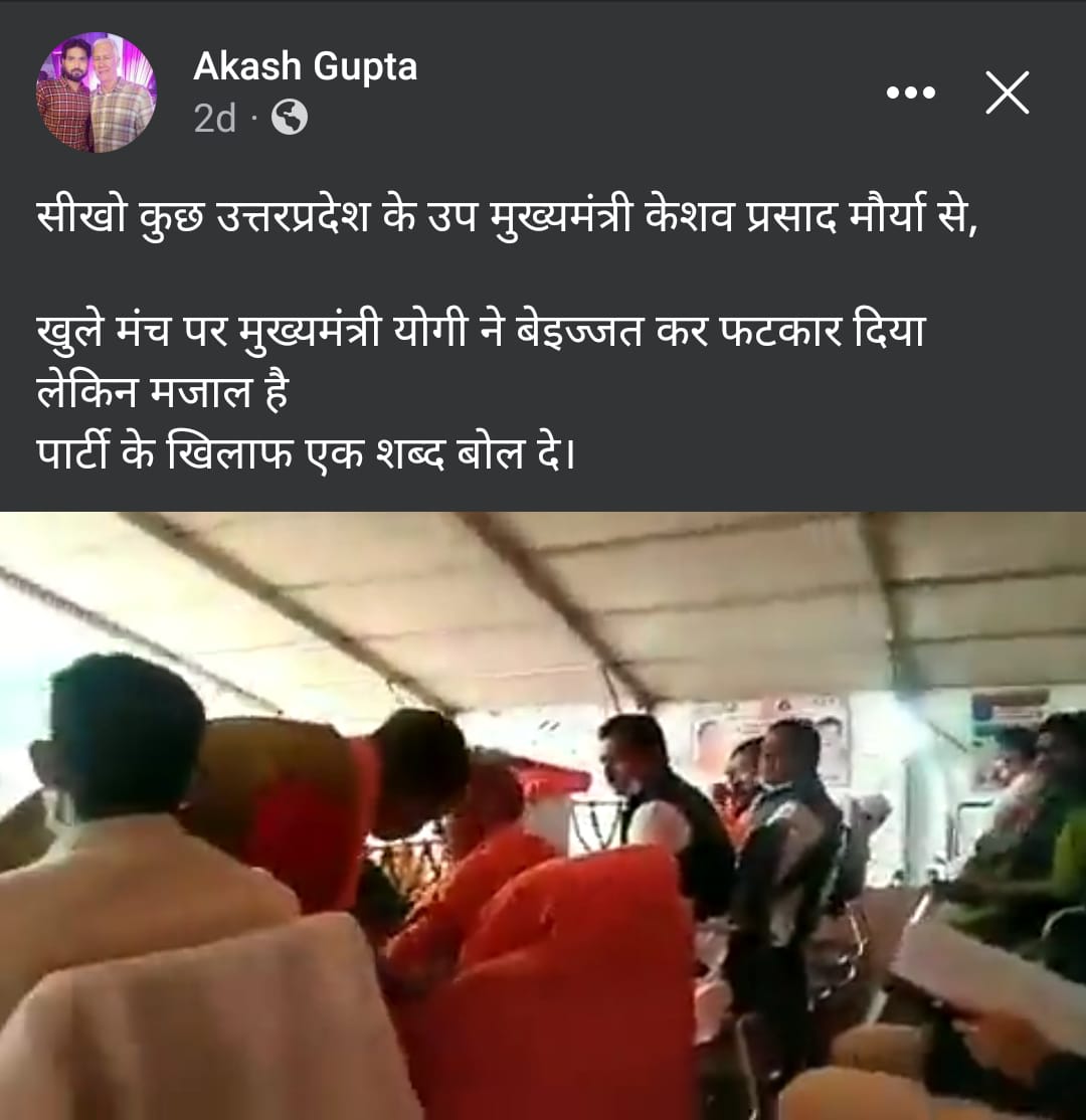 फ़ेसबुक पर वीडियो शेयर करते हुए एक यूज़र ने लिखा, "सीखो कुछ उत्तरप्रदेश के उप मुख्यमंत्री केशव प्रसाद मौर्या से, खुले मंच पर मुख्यमंत्री योगी ने बेइज्जत कर फटकार दिया लेकिन मजाल है पार्टी के खिलाफ एक शब्द बोल दे"