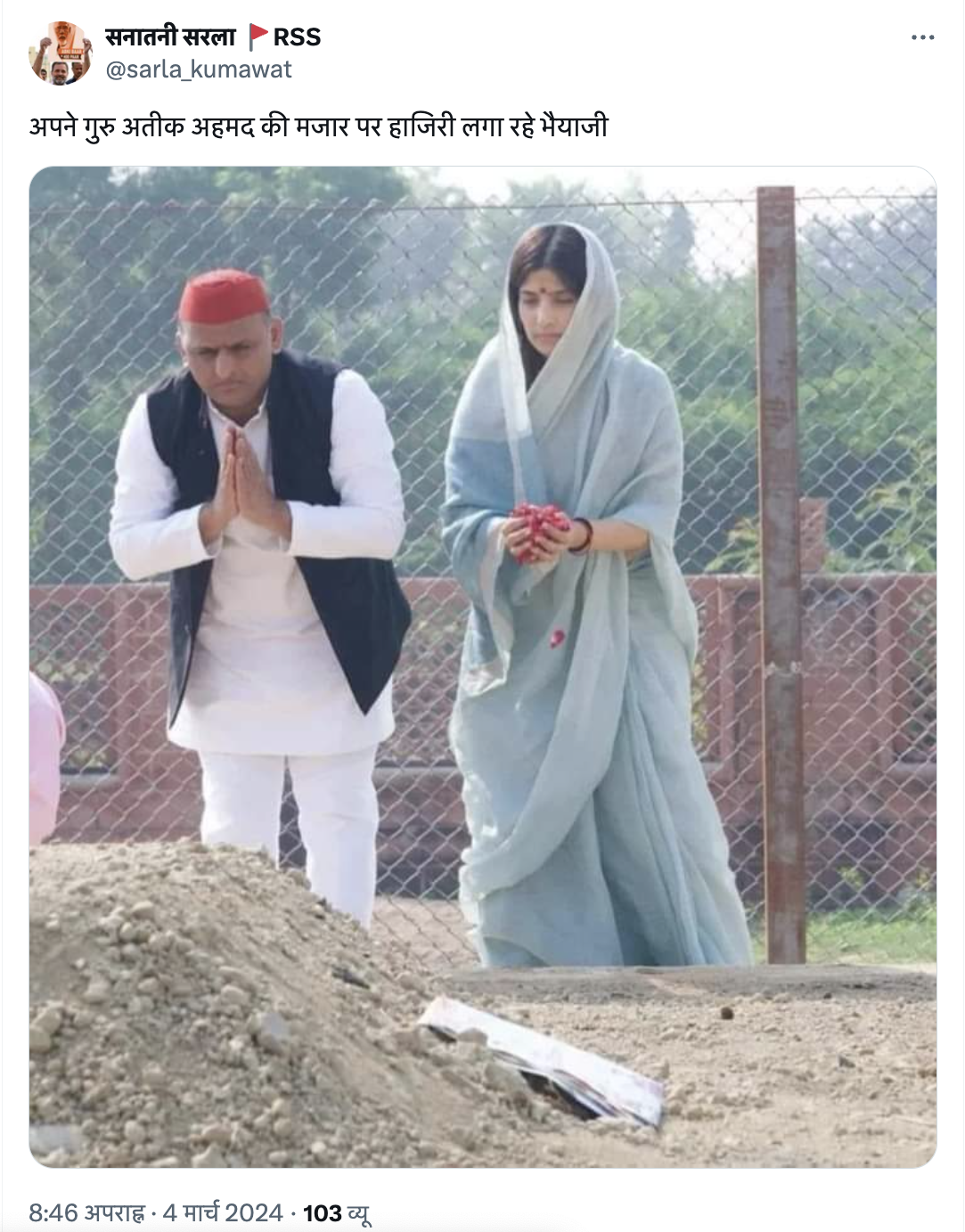 सोशल मीडिया पर समाजवादी पार्टी के अध्यक्ष अखिलेश यादव और उनकी सांसद पत्नी डिंपल यादव की हाथ जोड़े और फूल लिए तस्वीर वायरल है. यूजर सोशल मीडिया पर तस्वीर शेयर करते हुए दावा कर रहे हैं कि दोनों अतीक अहमद की कब्र पर फूल चढ़ा रहे हैं