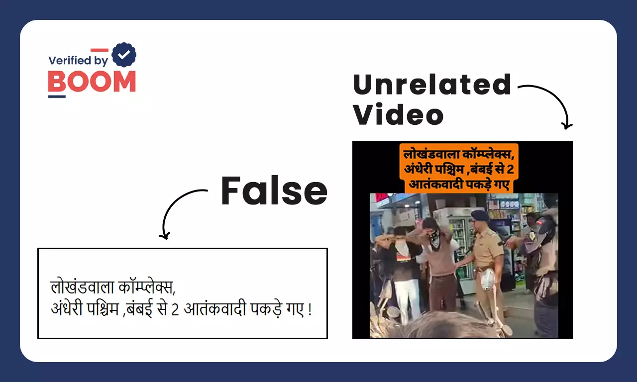 सोशल मीडिया पर लोखंडवाला कॉम्प्लेक्स, अंधेरी पश्चिम, मुंबई से 2 आतंकवादियों के पकड़े जाने के दावे से एक वीडियो वायरल है. इसमें पुलिस और जवानों द्वारा दो लोगों को गिरफ्तार करते हुए देखा जा सकता है.