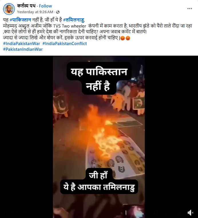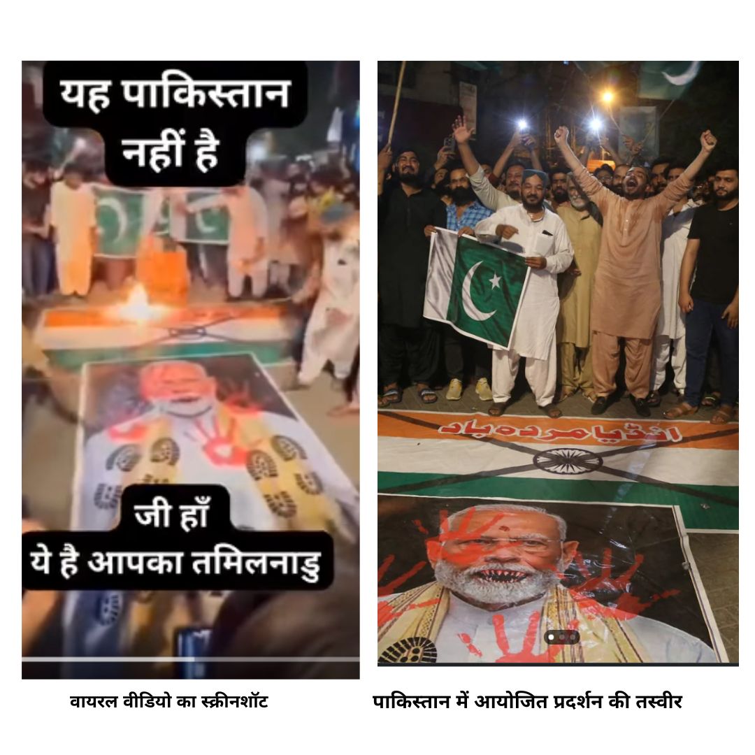 भारत-पाकिस्तान के बीच जारी तनाव के बीच सोशल मीडिया पर तमिलनाडु में पाकिस्तान के समर्थन में विरोध प्रदर्शन एवं तिरंगे के अपमान के दावे से एक वीडियो वायरल है. वायरल वीडियो में कुछ लोगों को तिरंगे एवं प्रधानमंत्री नरेंद्र मोदी के पोस्टर को जलाते हुए देखा जा सकता है.