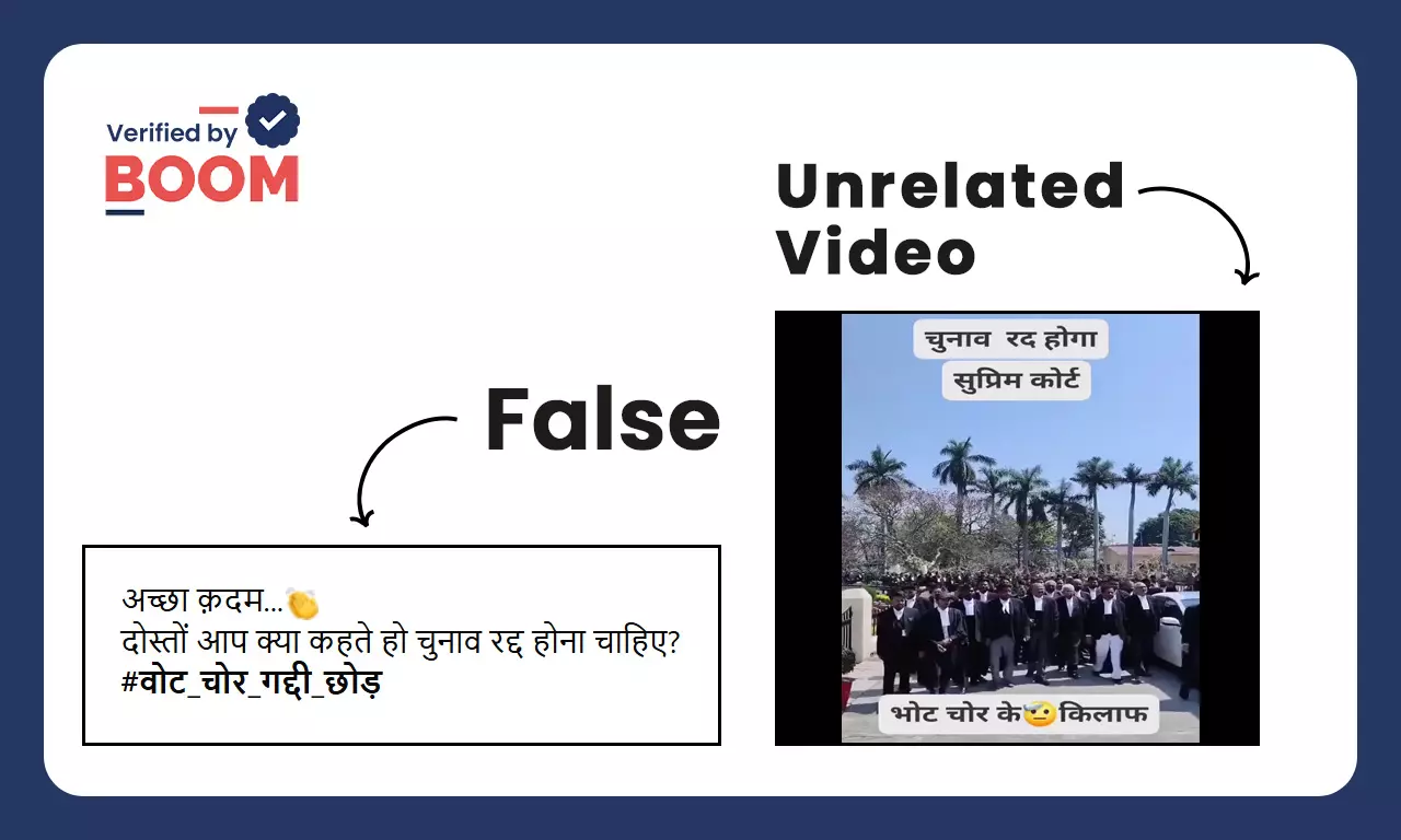 सोशल मीडिया पर बिहार में वोट चोरी को लेकर सुप्रीम कोर्ट में विरोध-प्रदर्शन और चुनाव रद्द किए जाने के दावे से एक वीडियो वायरल है. वीडियो में अधिवक्ताओं के एक समूह को चलते हुए और अभिवादन करते हुए देखा जा सकता है.