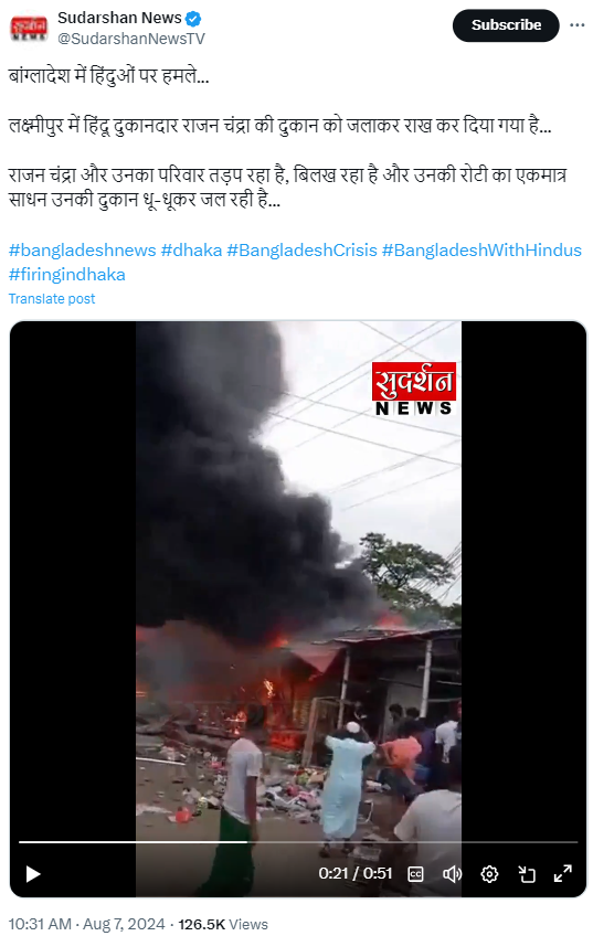 फेक न्यूज पेडलर सुदर्शन न्यूज ने एक्स पर इस वीडियो को शेयर करते हुए लिखा, 'बांग्लादेश में हिंदुओं पर हमले...लक्ष्मीपुर में हिंदू दुकानदार राजन चंद्रा की दुकान को जलाकर राख कर दिया गया है...राजन चंद्रा और उनका परिवार तड़प रहा है, बिलख रहा है और उनकी रोटी का एकमात्र साधन उनकी दुकान धू-धूकर जल रही है...'