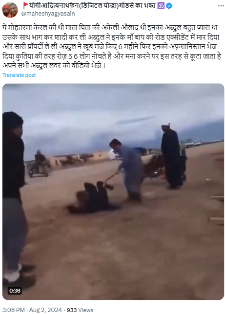 सोशल मीडिया पर एक महिला को बेरहमी से पीटते लोगों का एक वीडियो वायरल है. वीडियो के साथ सांप्रदायिक दावा किया जा रहा है कि ये लड़की केरल से है. इसने भाग कर एक मुस्लिम लड़के से शादी कर ली. लड़के ने उसकी सारी प्रॉपर्टी हड़प ली और उसे अफगानिस्तान भेज दिया, जहां रोज लड़की का शारीरिक शोषण होता है और मना करने पर उसके साथ बेरहमी से मारपीट की जाती है.