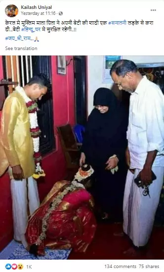 कैलाश उनियाल नाम के एक फ़ेसबुक यूज़र ने तस्वीर पोस्ट करते हुए कैप्शन में लिखा, "केरल मे मुस्लिम माता पिता ने अपनी बेटी की शादी एक #सनातनी लड़के से करा दी...बेटी #हिन्दू_घर मे सुरक्षित रहेगी..!! #जय_श्री_राम"