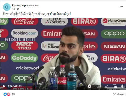 फ़ेसबुक पर एक यूज़र ने वीडियो शेयर करते हुए लिखा,'विराट कोहली ने क्रिकेट से लिया संन्यास, अलविदा विराट कोहली'