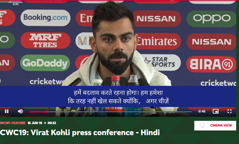 वायरल वीडियो से स्क्रीनग्रैब निकालकर रिवर्स इमेज सर्च करने पर आईसीसी क्रिकेट वर्ल्ड कप की आधिकारिक वेबसाइट पर वायरल वीडियो के समान 52 सेकंड्स की वीडियो मिली. विराट कोहली के कपड़े और बैकग्राउंड वायरल वीडियो जैसे ही है. 16 जून 2019 के इस वीडियो को 2019 में इंग्लैंड में हुए आईसीसी क्रिकेट वर्ल्ड कप की प्रेस कॉन्फ्रेंस बताया गया है.