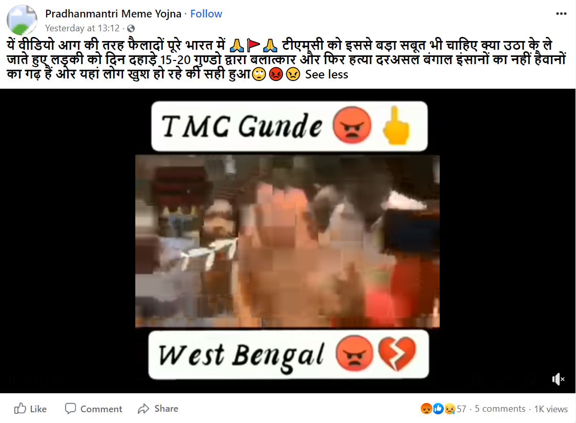 परेशान कर देने वाले दृश्यों का यह वीडियो कुछ पुरुषों द्वारा एक महिला को खींचते दिखाता है जिसके साथ लिखा है: "भाजपा कार्यकर्ता बूथ पोलिंग एजेंट *** बंगाल टीएमसी को इससे बड़ा सबूत भी चाहिए क्या उठा के ले जाते हुए लड़की को दिन दहाड़े 15-20 गुण्डो द्वारा बलात्कार और फिर हत्या दरअसल बंगाल इंसानों का नहीं हैवानों का गढ़ हैं ओर यहां लोग खुश हो रहे की सही हुआ"