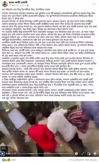 इसके बाद कुछ फ़्रेम्स के साथ रिवर्स इमेज सर्च करने पर हम बांग्लादेशी फ़ेसबुक यूज़र रहमत अली हलाली के पेज पर पहुंचे. इस पेज पर वीडियो का लम्बा वर्शन मौजूद है जो 27 अप्रैल 2021 को अपलोड किया गया था.