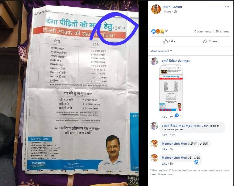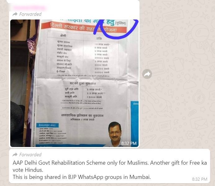 यह तस्वीर को चालाकी से फ़ोटोशॉप कर उसमें "मुस्लिम" शब्द अलग से जोड़ा है जो फ़र्ज़ी दावा करता है की पार्टी केवल मुस्लिम पीड़ितों के नुक्सान की भरपाई करेगी| यह ग़लत है|