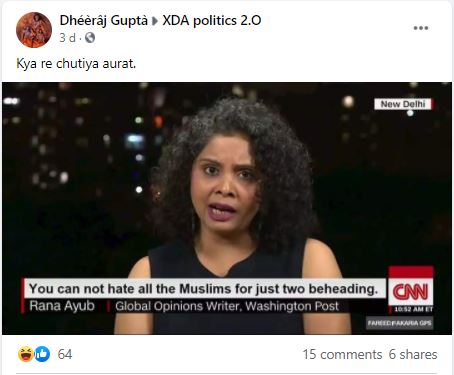 इसके अलावा, राणा अय्यूब ने शो में दिल्ली में हुए दंगों के बारे में बात की थी जिसका फ्रांस हमले से कोई सम्बन्ध नहीं है।