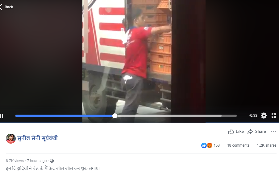 छः महीने पुराना एक वीडियो जो की फ़िलीपींस में रिकॉर्ड हुआ था, एक फ़र्ज़ी दावे के साथ दोबारा वायरल हो रहा है | वीडियो में एक डिलीवरीमैन को एक वाहन पर रखे पैकेट से ब्रेड के स्लाइस निकालते हुए देखा जा सकता है | बाद में वो उन पैकेट्स को बंद कर के वापस रख दे रहा है | लगभग एक मिनट लम्बे इस वीडियो को एक झूठे और साम्प्रदयिक दावे के साथ शेयर किया गया है | वायरल वीडियो के साथ ये कैप्शन है: इन जिहादियों ने ब्रेड के पैकेट खोले और उन पर थूक दिया। वे कोरोना फैलाने में कोई कसर नहीं छोड़ रहे हैं। आप कब तक सुरक्षित रहेंगे '।
