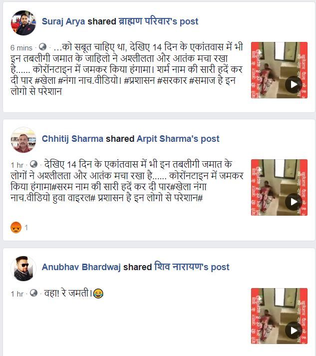 यही वीडियो फ़ेसबुक पर भी वायरल है | वहां इसके साथ कैप्शन में लिखा है: "तबलीगी जमात के लोगों ने अश्लीलता और आतंक मचा रखा है...... कोरोंनटाइन में जमकर किया हंगामा. सरम नाम की सारी हदें कर दी पार. खेला नंगा नाच. वीडियो हुवा वाइरल प्रशासन है इन लोगो से परेशान"