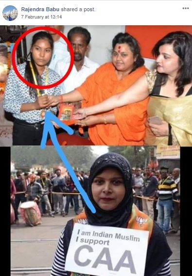 दो तस्वीरें वायरल हो रही हैं| एक में लड़की हिन्दू महासभा की राष्ट्रीय सचिव पूजा शकुन पांडेय द्वारा चाकू लेती नज़र आती है, वहीँ दूसरी तस्वीर में एक महिला बुर्का पहन नागरिकता संशोधन अधिनियम के समर्थन में प्लेकार्ड पकड़े खड़ी है| दावा किया जा रहा है की दोनों महिलाएं एक हैं|