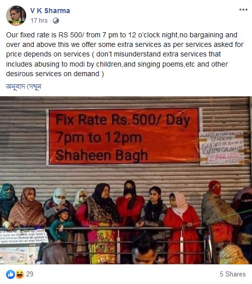 तस्वीर में दिखाया गया है कि एक बंद दुकान के सामने महिलाओं और बच्चों का एक समूह खड़ा है। शटर के ऊपर एक बैनर लिखा हुआ देखा जा सकता है, जिस पर "फिक्स रेट 500 / दिन। 7 बजे से 12 बजे शाहीन बाग" लिखा हुआ है। बूम ने पाया कि ये टेक्स्ट एडिट करके जोड़ा गया है।