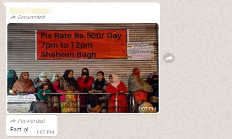 हाल ही में, भारतीय जनता पार्टी (भाजपा) के कई सत्यापित हैंडल, जिनमें भाजपा के सूचना और प्रौद्योगिकी के प्रभारी अमित मालवीय भी शामिल हैं, ने एक वीडियो ट्वीट किया, जिसमें दावा किया गया कि शाहीन बाग के प्रदर्शनकारियों को प्रदर्शन के लिए राशि का भुगतान किया जाता है। बूम स्वतंत्र रूप से दावे का सत्यापन नहीं कर सका है।