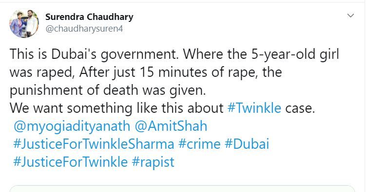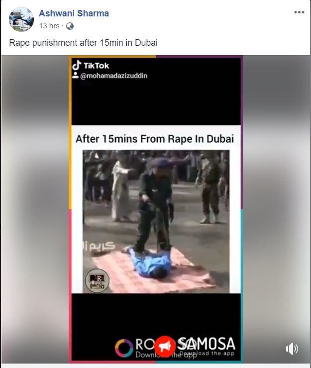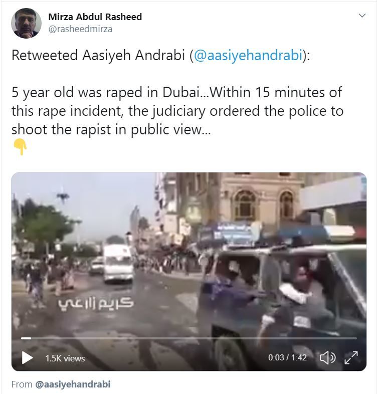 1 मिनट 42 सेकेंड के वीडियो में आरोपी को पुलिसकर्मियों द्वारा एक पॉइंट ब्लैंक रेंज से गोली मारते हुए दिखाया गया है । विरोध के बीच, उनकी लाश को एक क्रेन से बांधकर लटका दिया गया। वीडियो के साथ दिए गए कैप्शन में लिखा गया है, "दुबई में 5 साल की बच्ची के साथ बलात्कार किया गया ... इस बलात्कार की घटना के 15 मिनट के भीतर, न्यायपालिका ने पुलिस को सार्वजनिक रुप से बलात्कारी को गोली मारने का आदेश दिया ..."