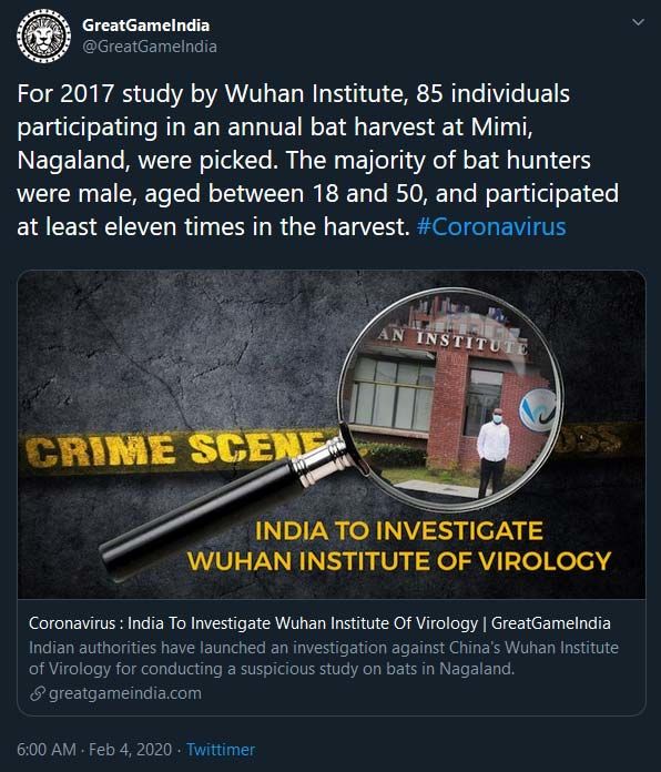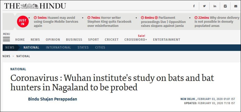 ऊपर दिया गया कोट 3 फरवरी की सुबह, सुबीर धर नाम के यूज़र द्वारा पोस्ट किए गए एक ट्वीट से आया है। वह द हिंदू के एक लेख का हवाला देते हुए कोट कर रहे थे। लेख की हेडलाइन का हिंदी अनुवाद कुछ इस प्रकार था, "कोरोनावायरस: नागालैंड में चमगादड़ों और बैट हंटर्स पर वुहान संस्थान द्वारा किए गए अध्ययन की जांच की जाएगी।" थोड़ा आगे पढ़ने पर सब-टेक्स्ट के साथ एक टेक्स्ट बॉक्स था जिसमें लिखा था "गोपनीयता में डूबा हुआ"।