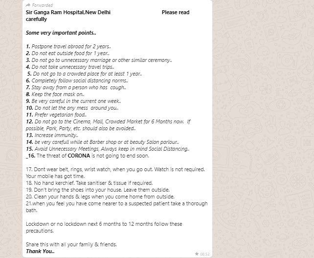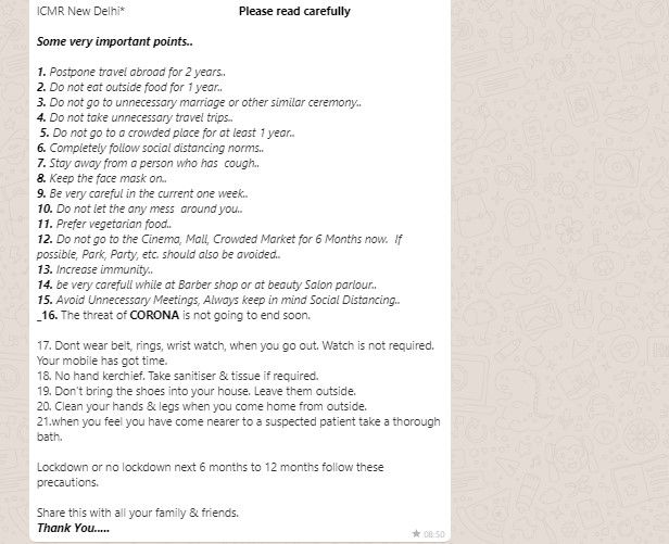 कोविड-19 से बचाव हेतु एक प्रतिबंधक उपायों जैसे सफ़र ना करना, सोशल डिस्टन्सिंग का पालन करना इत्यादि की लिस्ट ग़लत तरीक़े से इंडीयन काउन्सिल ऑफ मेडिकल रीसर्च (आई.सी.एम.आर) और दिल्ली के सर गंगा राम हॉस्पिटल से जोड़ी जा रही है । आई.सी.एम.आर कोविड-19 के लिए हो रही रीसर्च का भारत में सर्वोच्च स्थान है और सर गंगा राम हॉस्पिटल, दिल्ली में कोविड-19 के इलाज के लिए काम कर रहा है।