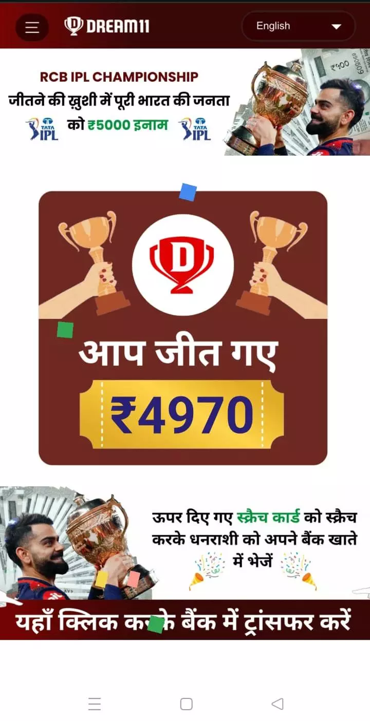 सोशल मीडिया पर शेयर किए गए एक पोस्ट के लिंक को ओपन करने पर इसमें एक वेबपेज ओपन हुआ. इस वेबपेज पर Dream 11 और IPL का लोगो है. इसके वेबपेज पर RCB के आईपीएल चैंपियनशिप जीतने की खुशी में पूरी भारत की जनता को ₹5,000 के इनाम का दावा किया गया है और इसके साथ ही रुपये प्राप्त करने के लिए स्क्रैच कार्ड बना है.
