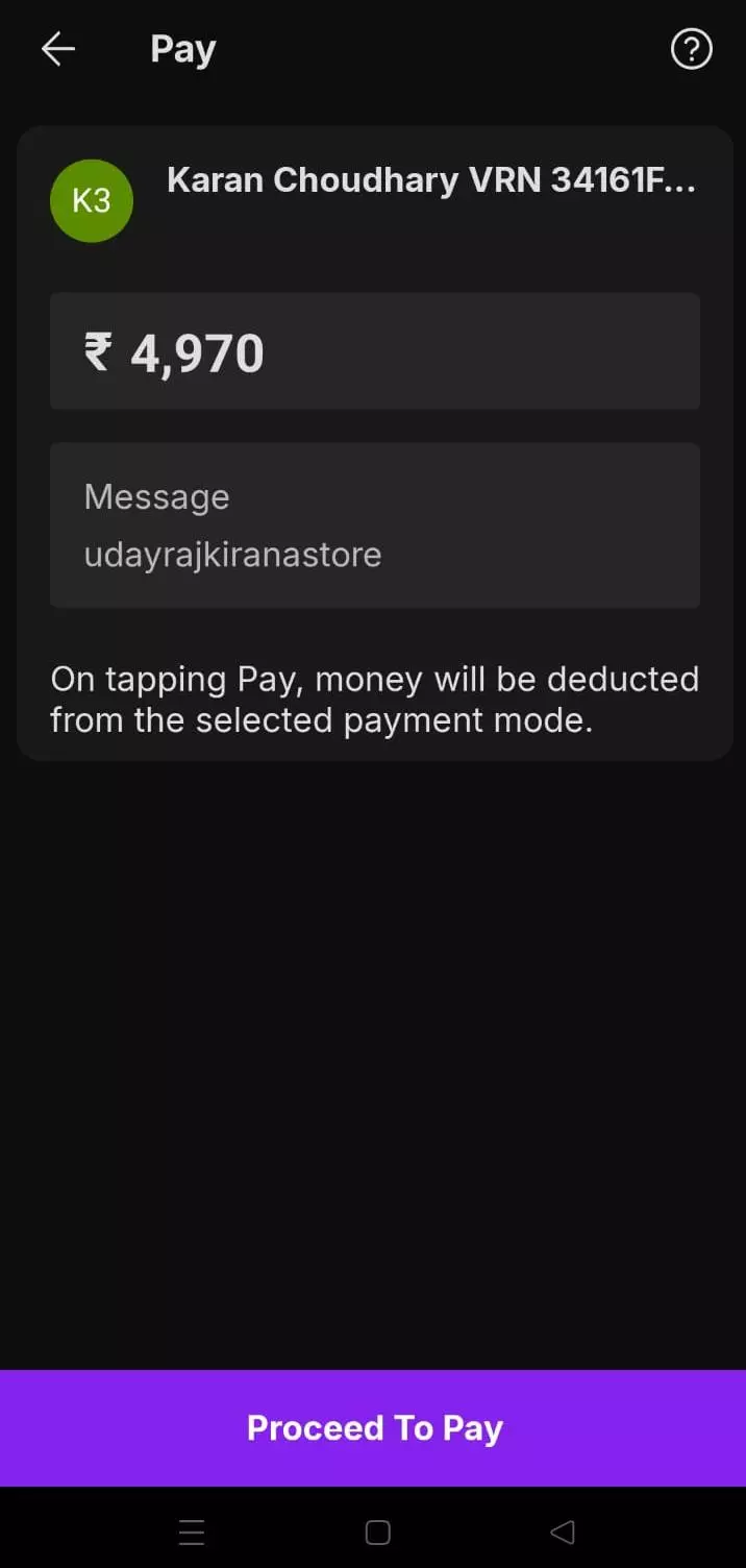 इस राशि को प्राप्त करने के लिए स्क्रैच कार्ड के ठीक नीचे लिंक पर क्लिक करने के लिए निर्देशित किया गया. हमने जैसे ही इस लिंक पर क्लिक किया तो हमारे मोबाइल पर फोनपे एप ओपन हुआ और इसमें एक Karan Choudhary VRN नाम के व्यक्ति को 4970 रुपये का भुगतान करने के लिए रिक्वेस्ट मिली. इसको प्रोसीड करने पर हमारे अकाउंट से पैसे कट सकते थे, इसलिए हमने उसे वहीं बंद कर दिया.