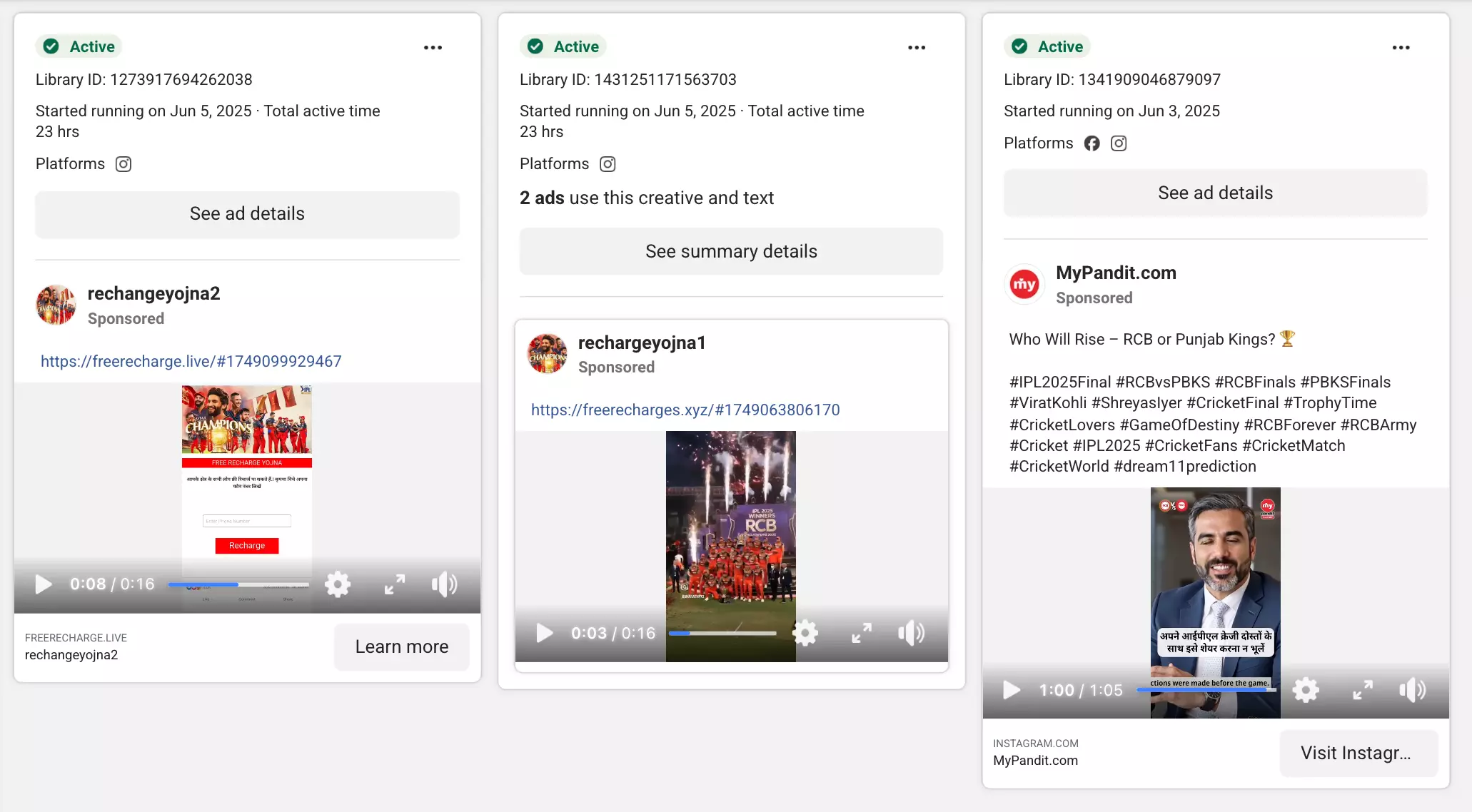 फेसबुक पर RCB 2025 नाम के पेज पर स्कैम लिंक के साथ एक वीडियो शेयर किया गया है. वीडियो में एक ग्राफिक पोस्टर है जिसमें लिखा है, 'आरसीबी के जीतने की खुशी में पूरे भारत की जनता को 5000 रुपये का इनाम, पैसे भेजने के लिए क्लिक करें.' वीडियो के एक साथ वॉइस ओवर भी जुड़ा है.