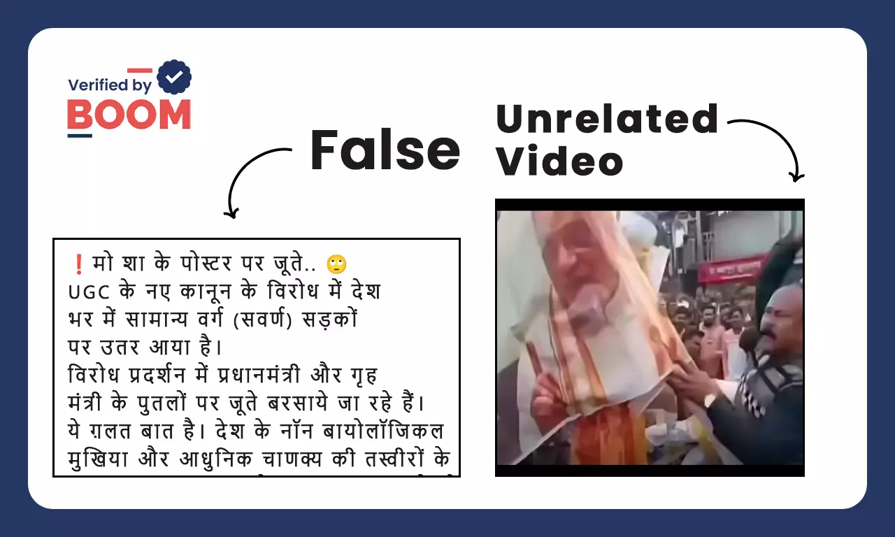 फेसबुक यूजर ने वीडियो को शेयर करते हुए लिखा है, "मो शा के पोस्टर पर जूते, UGC के नए कानून के विरोध में देश भर में सामान्य वर्ग (सवर्ण) सड़कों पर उतर आया है, विरोध प्रदर्शन में प्रधानमंत्री और गृह मंत्री के पुतलों पर जूते बरसाये जा रहे हैं..." आर्काइव लिंक