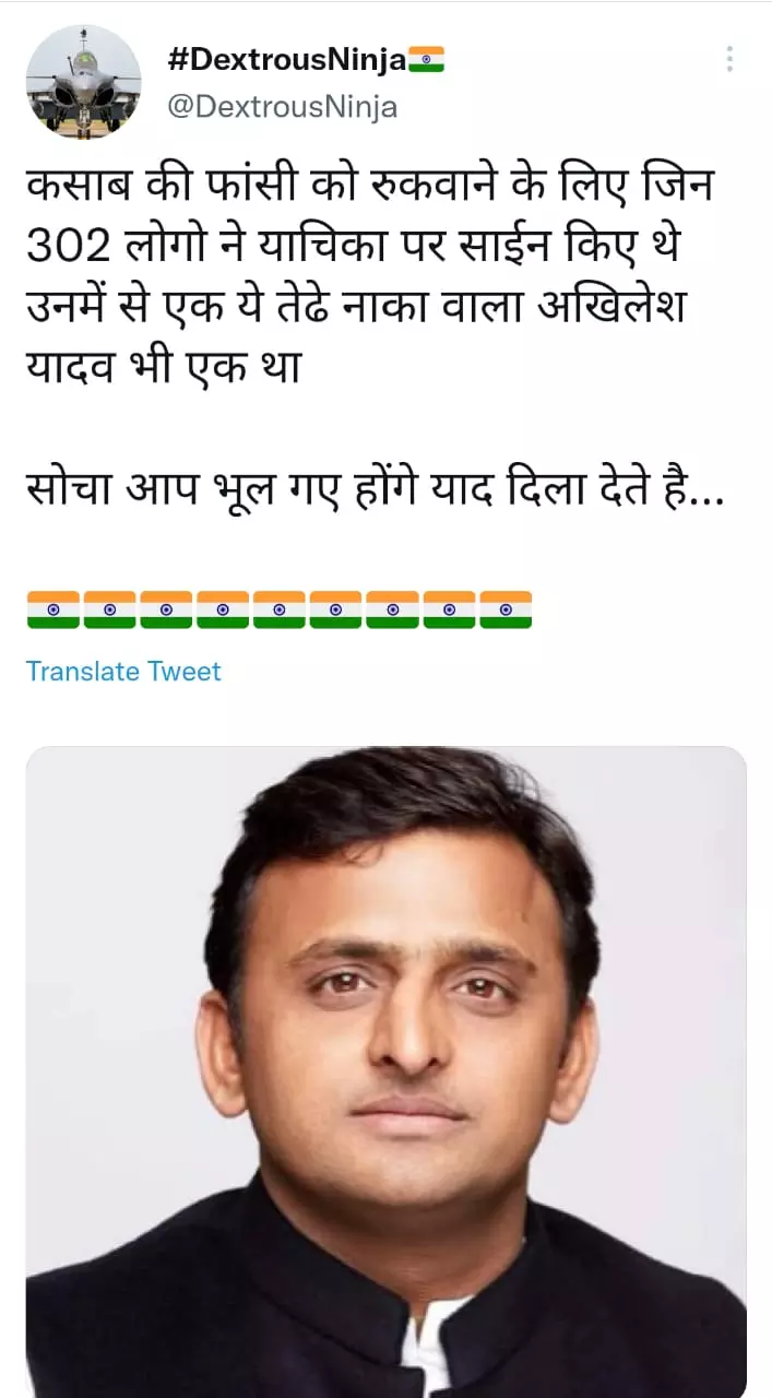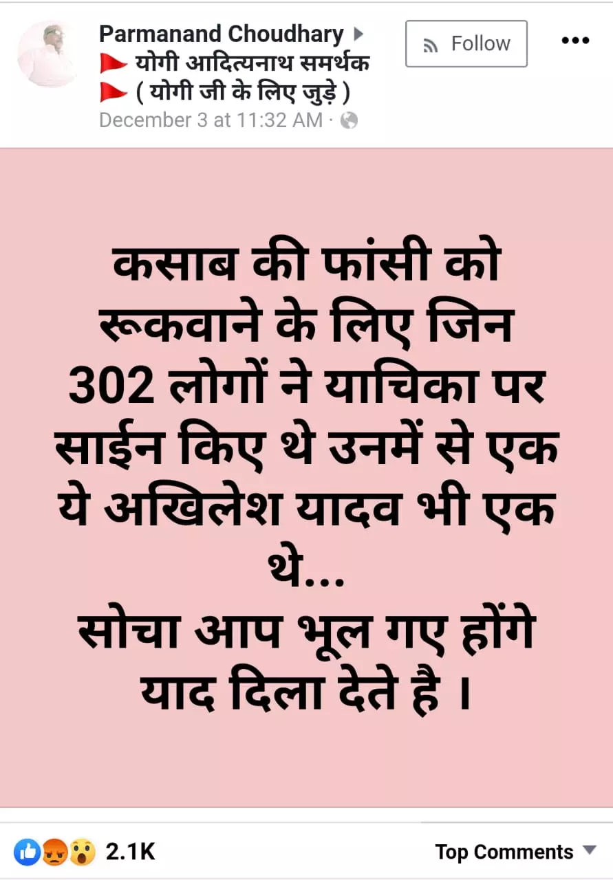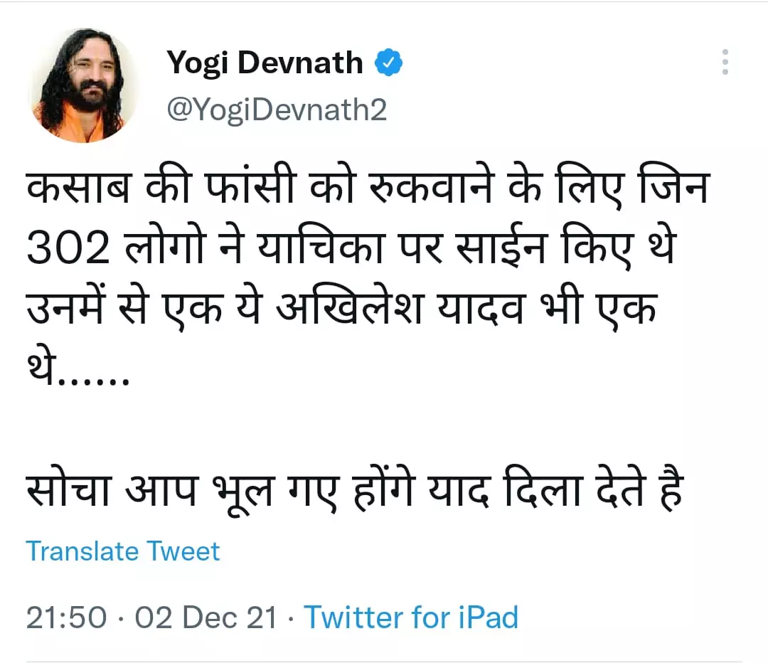 योगी देवनाथ ने 2 दिसंबर 2021 के अपने ट्वीट में लिखा कि 'कसाब की फांसी को रुकवाने के लिए जिन 302 लोगो ने याचिका पर साईन किए थे उनमें से एक ये अखिलेश यादव भी एक थे......सोचा आप भूल गए होंगे याद दिला देते है'.