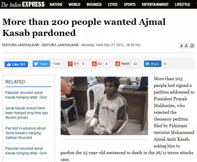 हमें अपनी जांच के दौरान इंडियन एक्सप्रेस की 21 नवंबर 2012 को प्रकाशित एक रिपोर्ट मिली, जिसमें बताया गया है कि पाकिस्तानी आतंकवादी अजमल कसाब की फांसी रुकवाने के लिए 203 से अधिक लोगों ने राष्ट्रपति प्रणब मुखर्जी को संबोधित एक याचिका पर हस्ताक्षर किए थे.