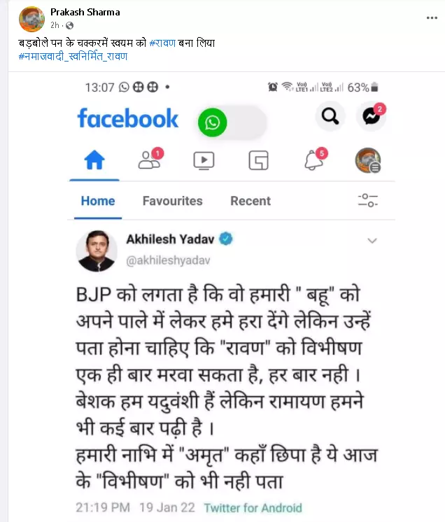 एक यूज़र ने इस स्क्रीनशॉट को फ़ेसबुक पर शेयर करते हुए कैप्शन में लिखा 'बड़बोले पन के चक्करमें स्वयम को #रावण बना लिया #नमाजवादी_स्वनिर्मित_रावण'.