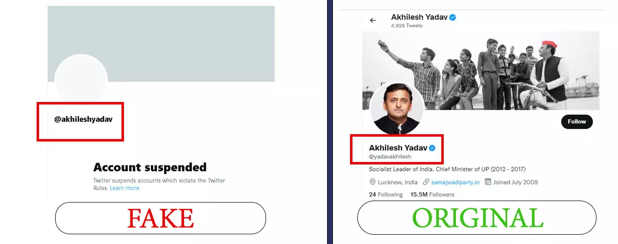 बूम ने वायरल ट्वीट के स्क्रीनशॉट को ध्यान से देखा तो पाया कि उसमे अखिलेश यादव के नाम से बने ट्विटर एकाउंट का यूज़रनेम @akhileshyadav लिखा हुआ है जबकि अखिलेश के ओरिजिनल अकाउंट का यूजरनेम @yadavakhilesh है. बूम ने @akhileshyadav को ट्विटर पर सर्च किया तो पाया कि ये अकाउंट सस्पेंड किया जा चुका है.
