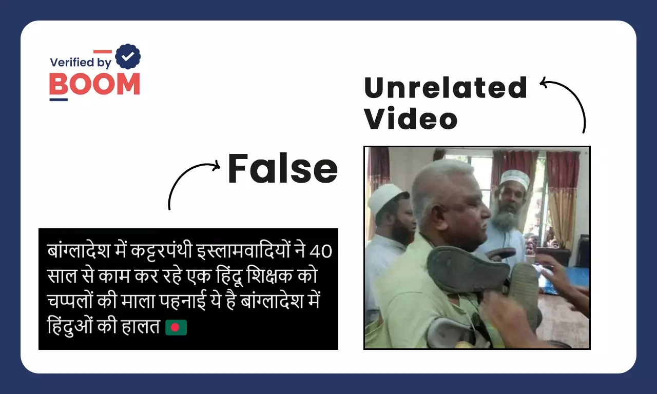 बांग्लादेश में एक बुजुर्ग शख्स को चप्पलों की माला पहनाने का वीडियो सोशल मीडिया पर वायरल है. दावा किया जा रहा है कि वहां 40 साल से काम कर रहे एक हिंदू शिक्षक के साथ यह दुर्व्यवहार किया गया.