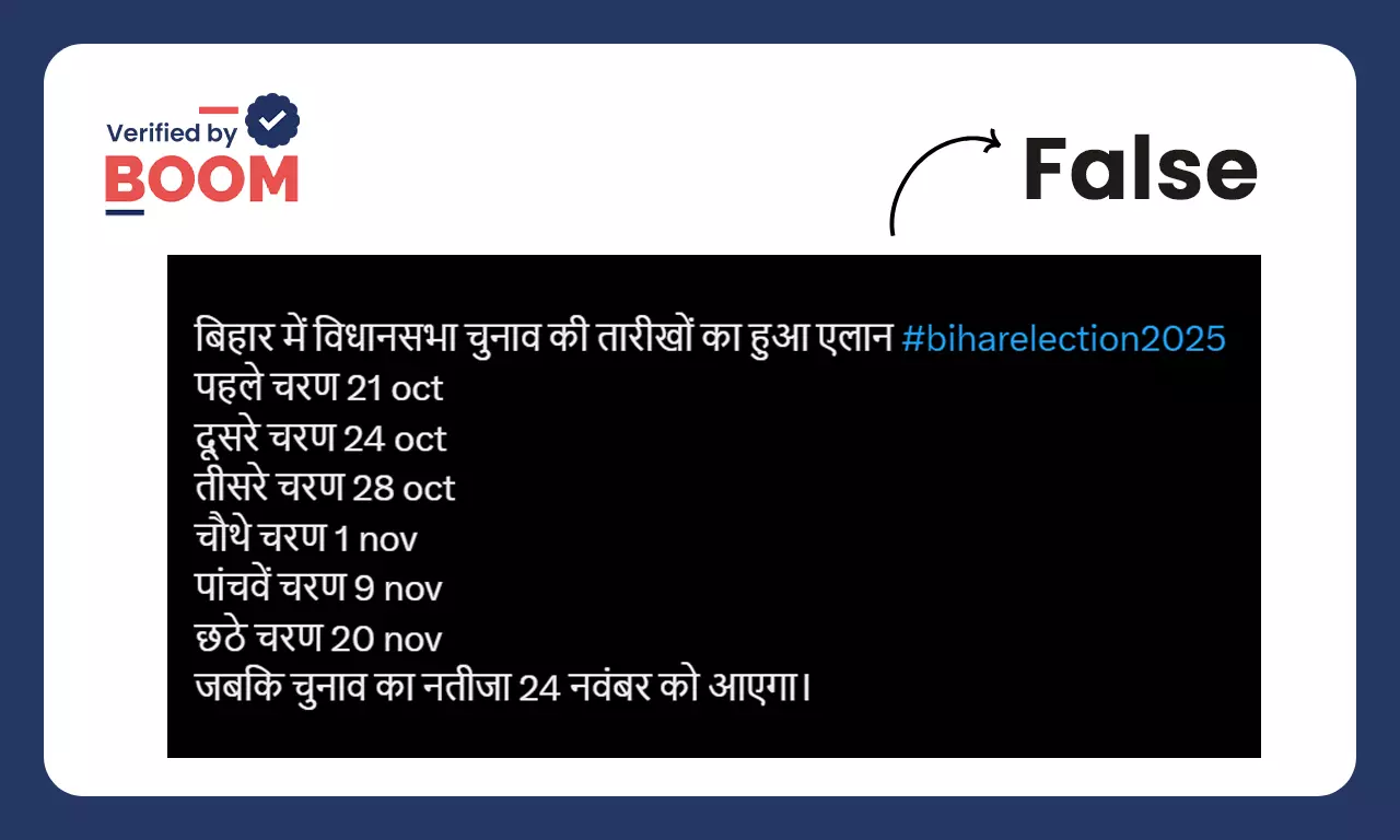 बूम ने जांच में पाया कि बिहार विधानसभा चुनाव की तारीखों की घोषणा अभी नहीं की गई है. बिहार मुख्य निर्वाचन अधिकारी के मीडिया प्रभारी ने वायरल दावे को गलत बताया है.